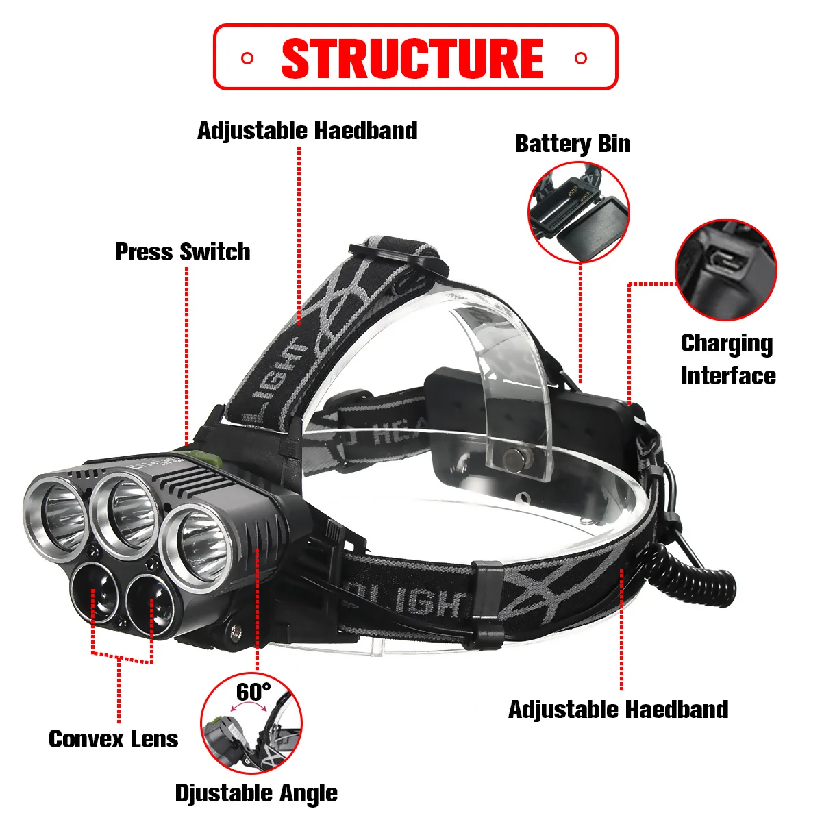 Best For You USB Rechargeable Headlight 50000lm 3*T6+2*Q5 LED Head Lamp Fishing Flashlight Torch Head Light 1865